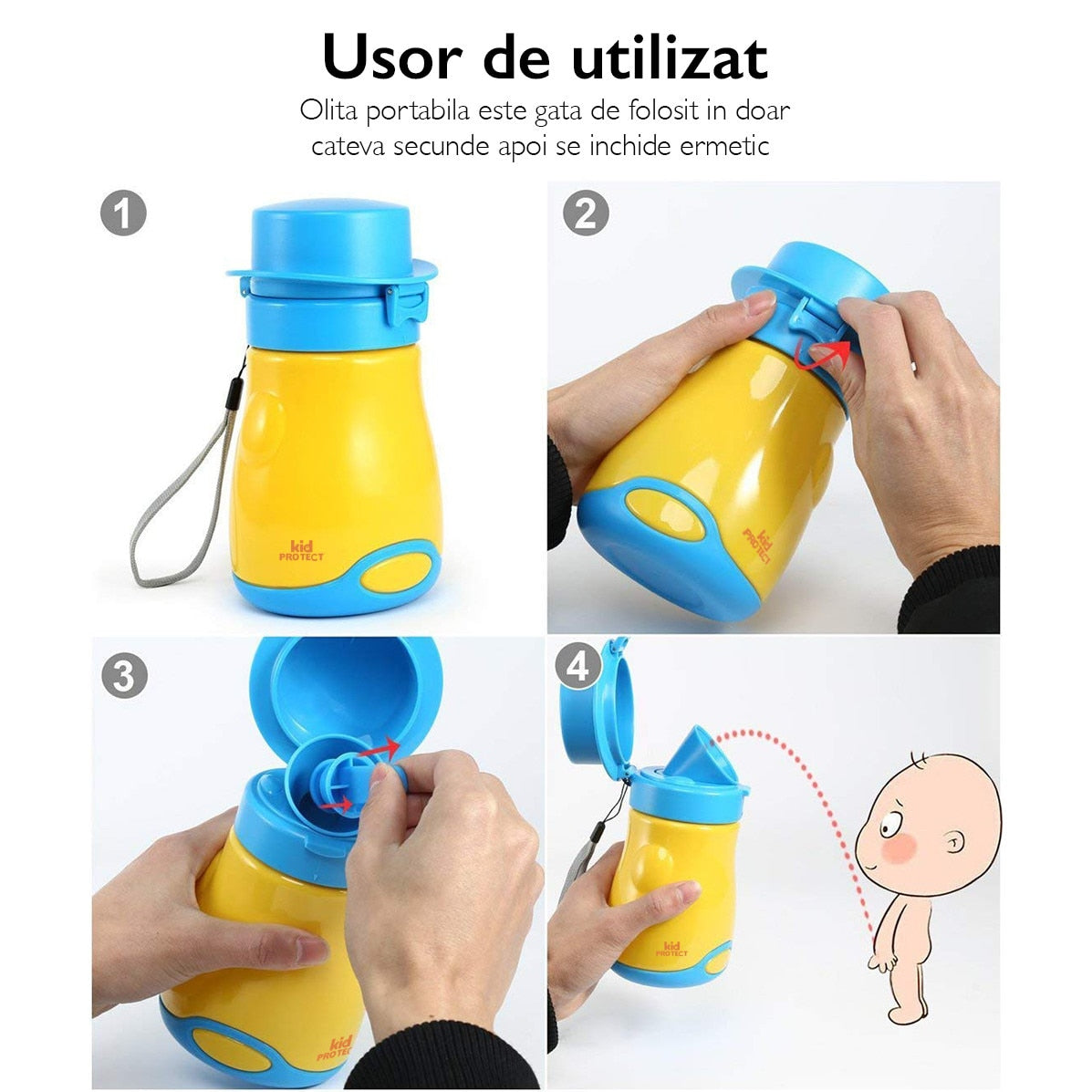 Olita Portabila Pentru Calatorie Kidprotect® Baby Boy, Pentru Baieti, Cu capac Silicon Anti Miros, Usor de Curatat, Anti Scurgere, 600ml, Galben