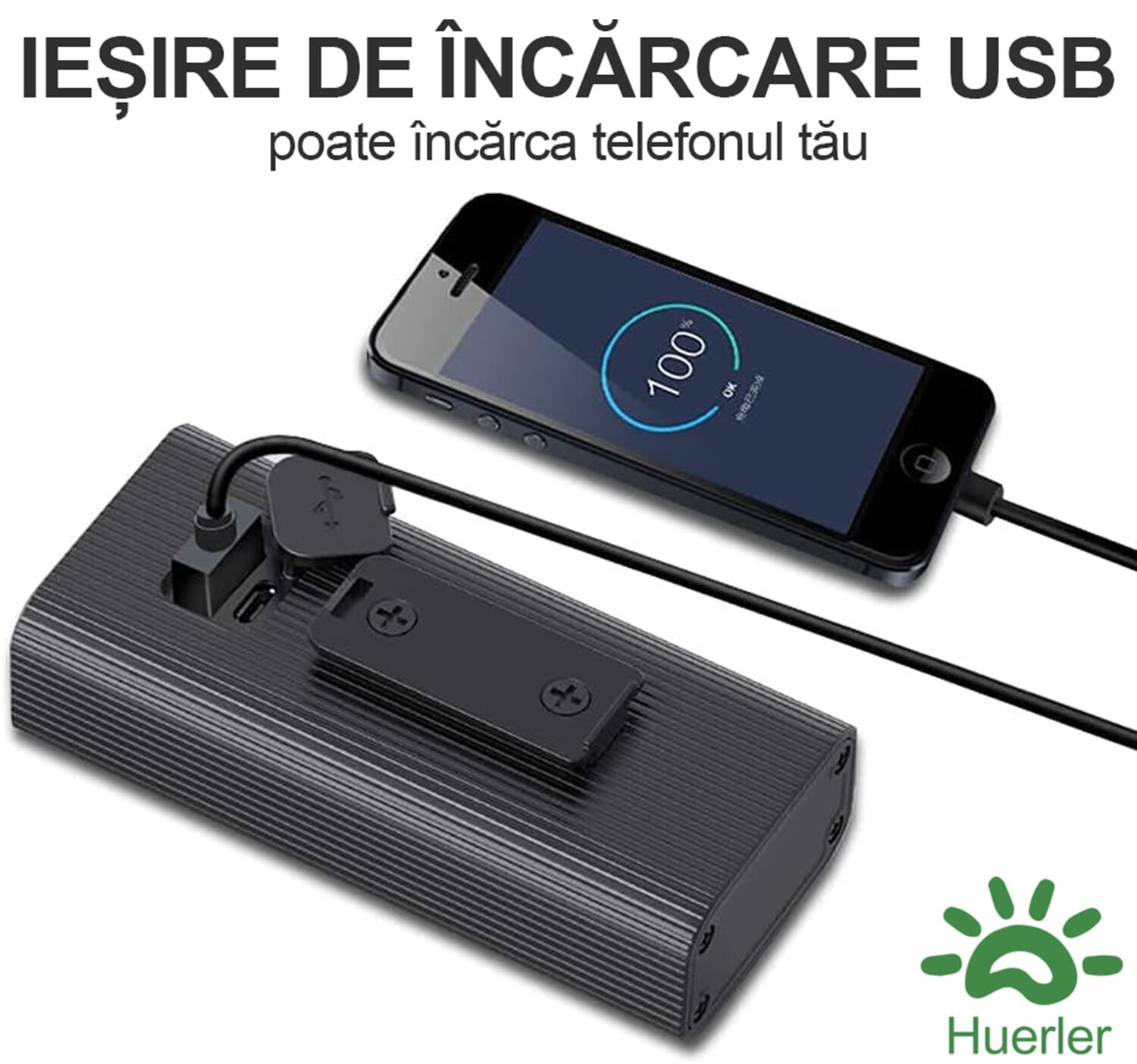 ✅ Functie de baterie externa (powerbank) – farul poate incarca telefonul sau alte dispozitive, util in calatorii sau trasee lungi.