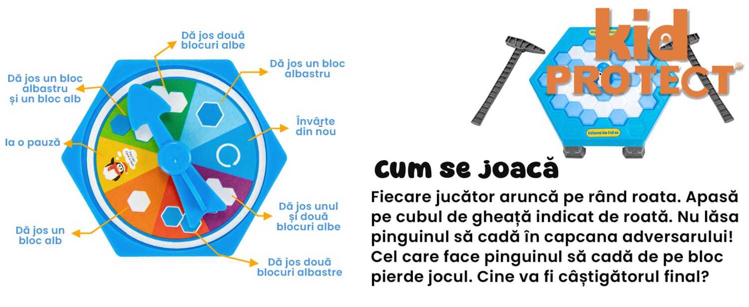 Un joc de familie amuzant si interactiv, ideal pentru copii si parinti! Scopul este sa lovesti cuburile de gheata fara sa lasi pinguinul sa cada, dezvoltand coordonarea si strategia celor mici.