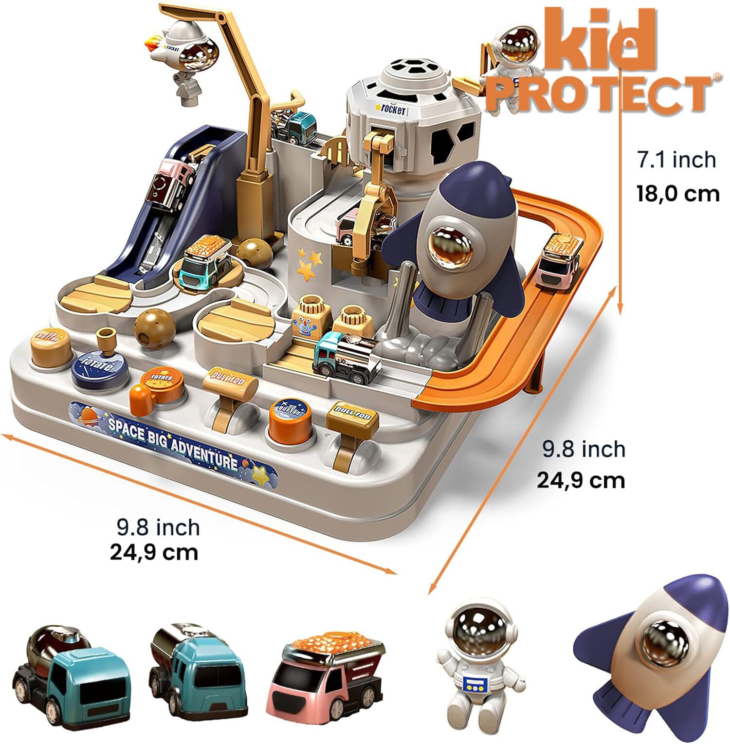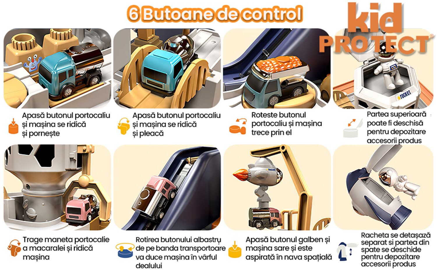 Set Jucarie Interactiva Circuit de Curse KidProtect® Space Track, Butoane, Manete si Rotite, Actionabile, Astronaut, Racheta Spatiala, Pod Mobil, Macara Mobila, Fara BPA, Masinute Incluse, 6 Butoane