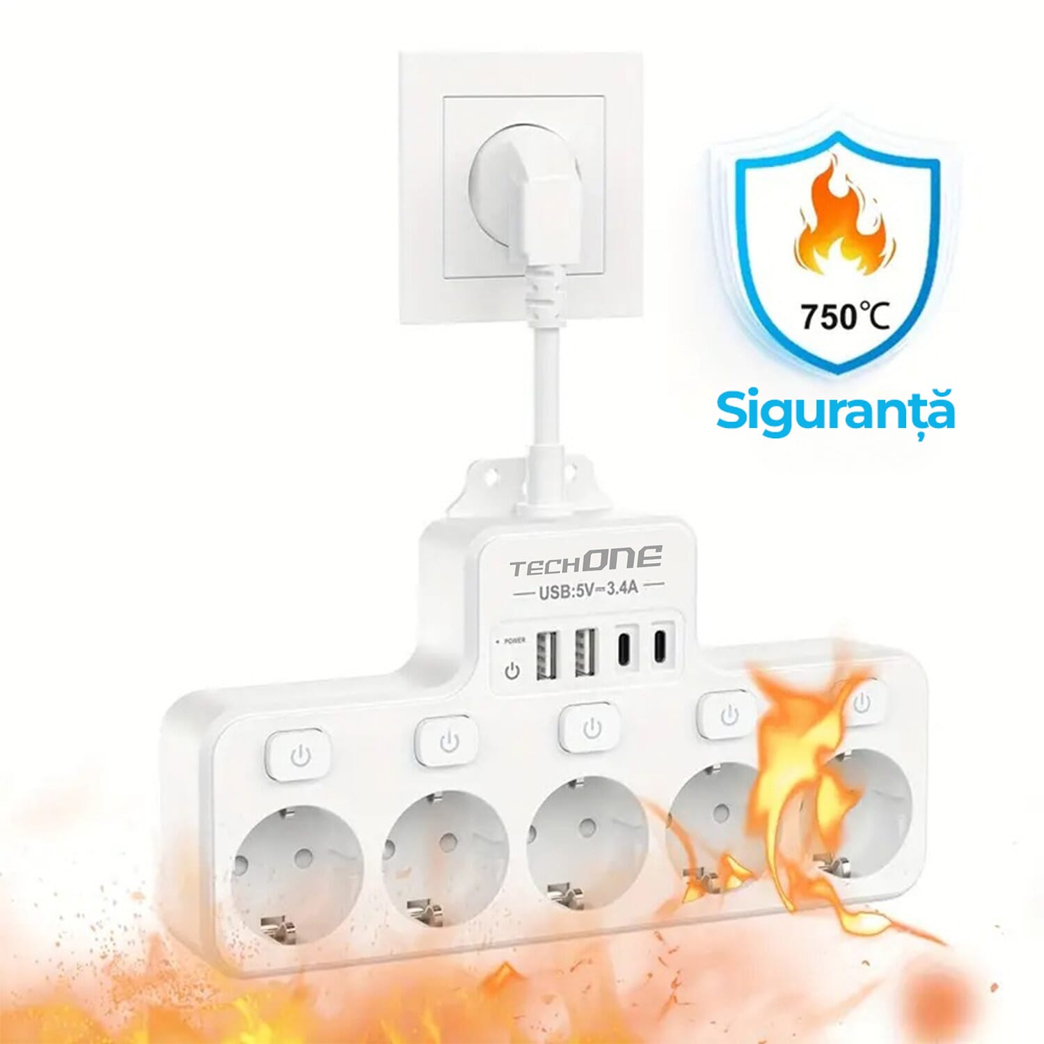 Prelungitor Scurt Techone® PowerHub 9X, 4000W, 16A, 5 Prize Normale cu Intrerupator Individual, 2 USB, 2 USB Type C, Posibilitate Montare Perete sau Masa, Cablu Cupru, Ignifug, Alb