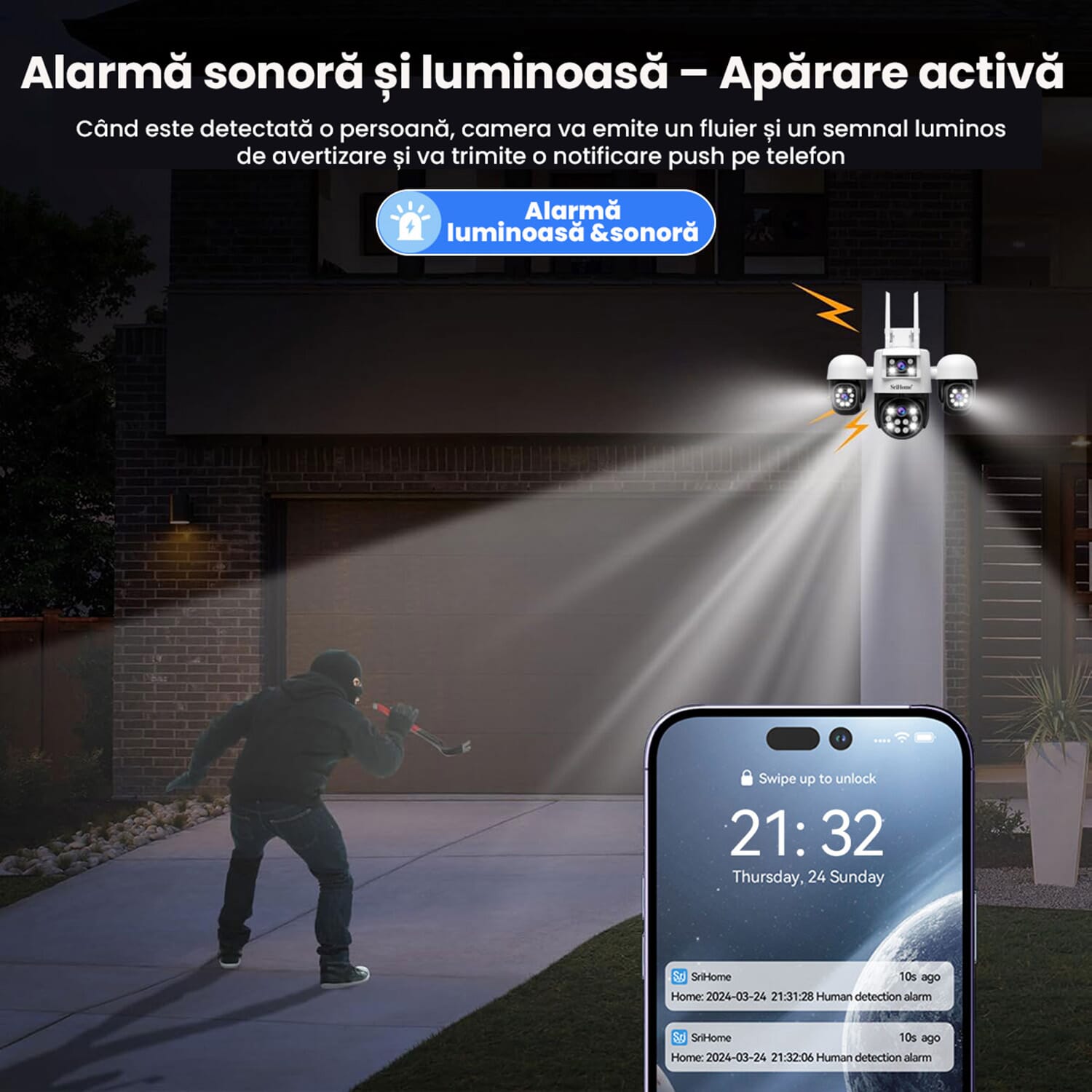 Camera este echipata cu alarma sonora si luminoasa integrata, care se activeaza automat la detectarea miscarii suspecte. Aceasta functie are rol dublu: descurajeaza imediat intrusii si atrage atentia proprietarului, oferind un plus de siguranta fata de camerele obisnuite.