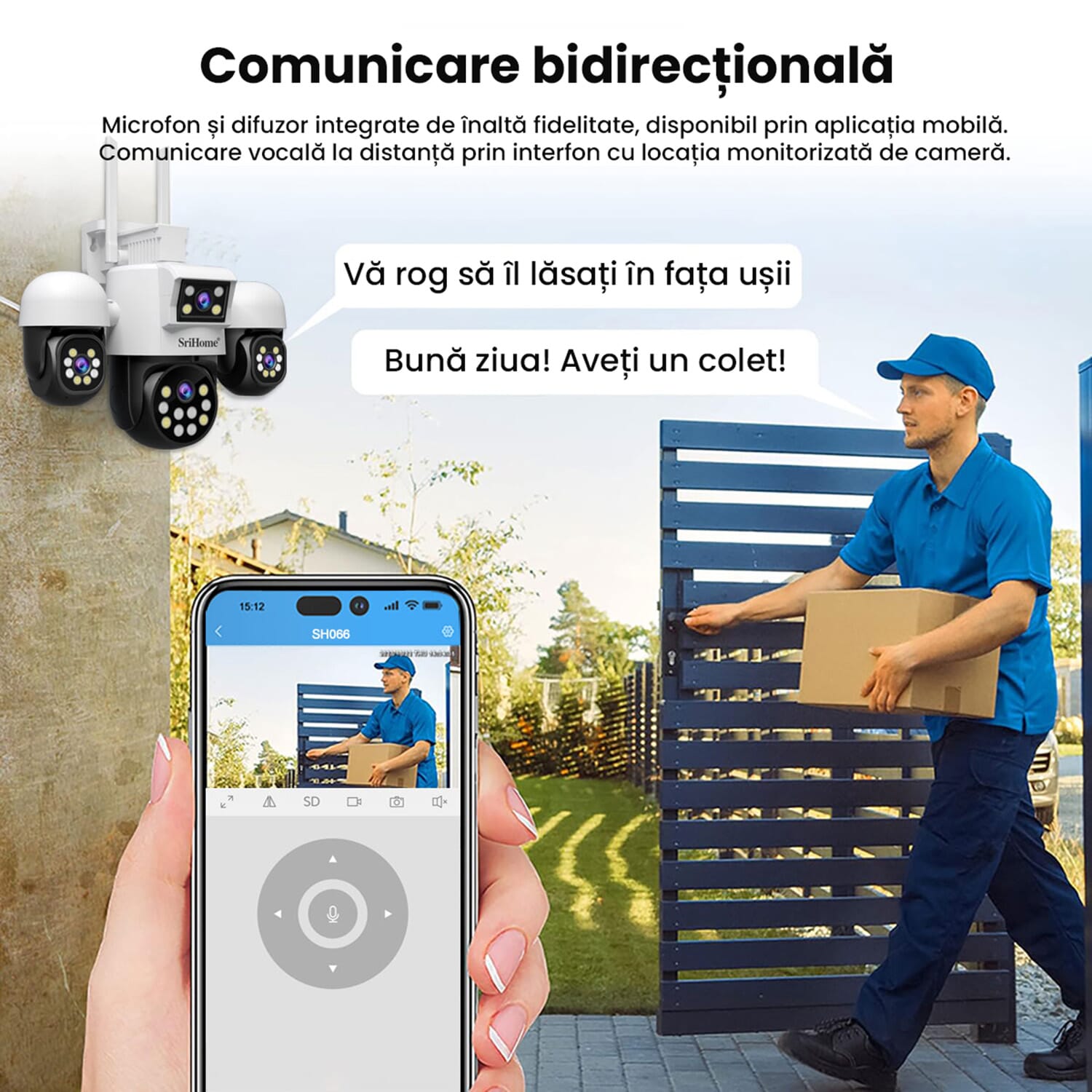 Camera este dotata cu sistem de comunicare bidirectionala, avand microfon si difuzor integrate, ceea ce iti permite sa asculti sunetele din jurul camerei si sa transmiti mesaje vocale in timp real direct din aplicatie – ideal pentru a da instructiuni, a linisti pe cineva sau a descuraja intrusii.