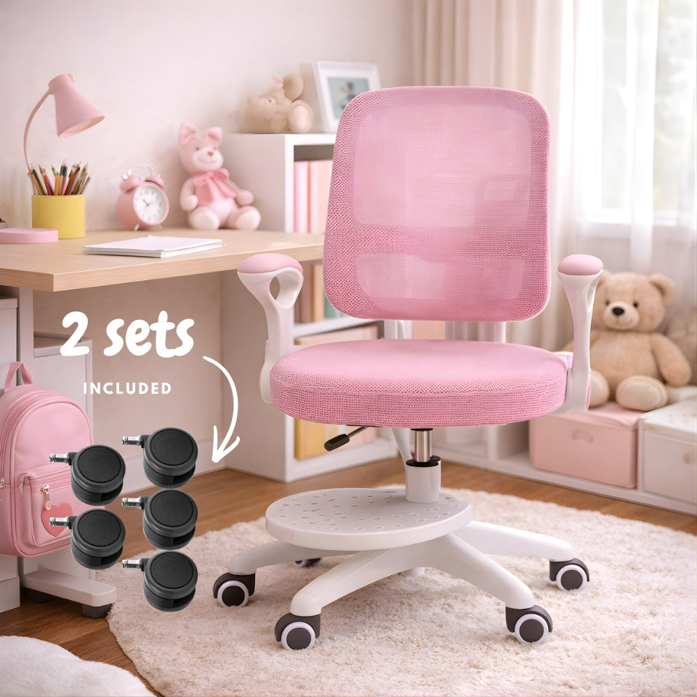 Scaun De Birou Copii Premium Ergonomic KD Home® ErgoKid, Cadru Solid, 2 Seturi Roti Incluse, Inaltime Reglabila, Roti Silentioase Silicon, Suport Picioare Ajustabil, Spatar Ajustabil pe Inaltime, Cotiere Rabatabile, Rezistent la Foc, Pana la 120 kg, Roz