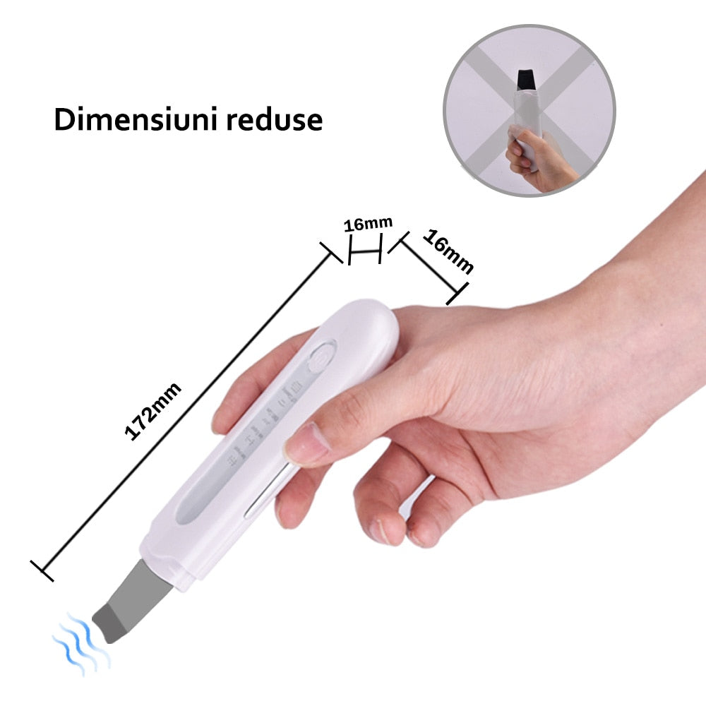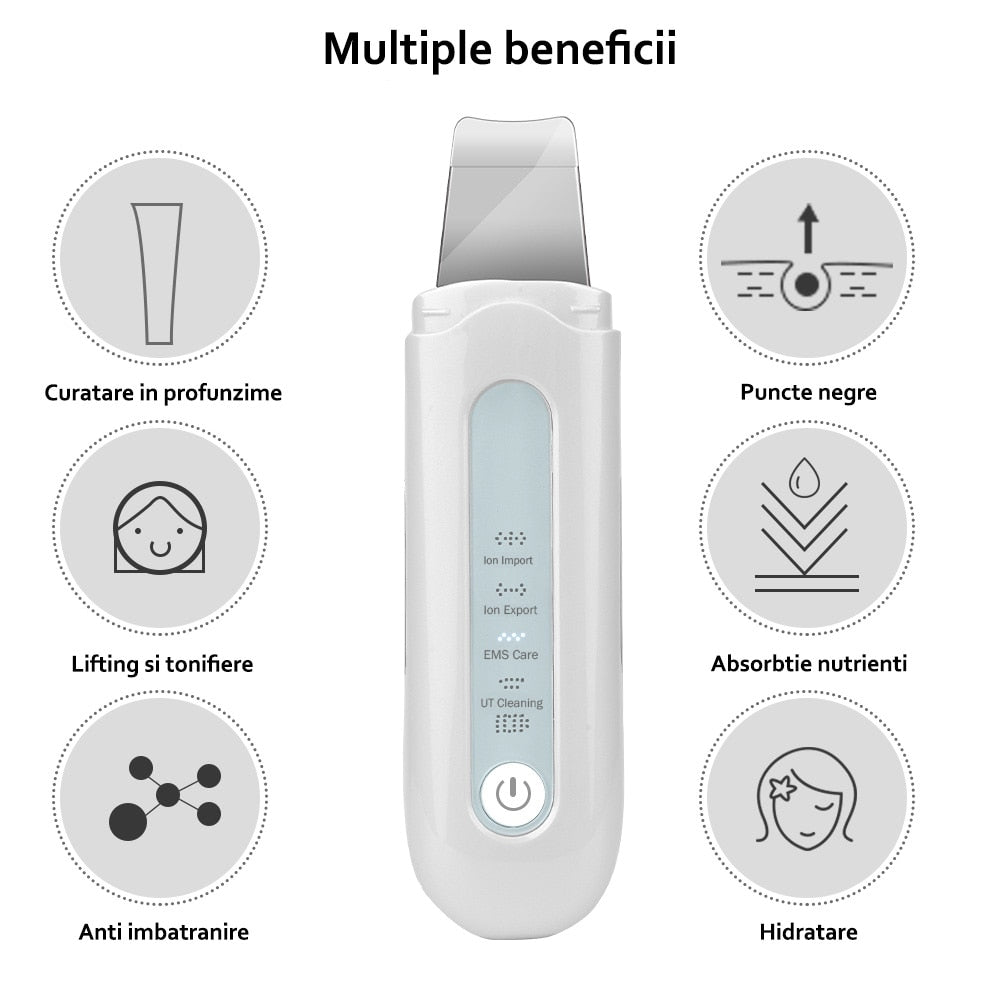Aparat de curatare faciala cu ultrasunete, Horigen™ Ultrasonic Cleaner, dispozitiv cu ioni, indepartare puncte negre, hidratare, skin scrubber, peeling, curatare ten, anti rid, anti imbatranire, acumulator, alb