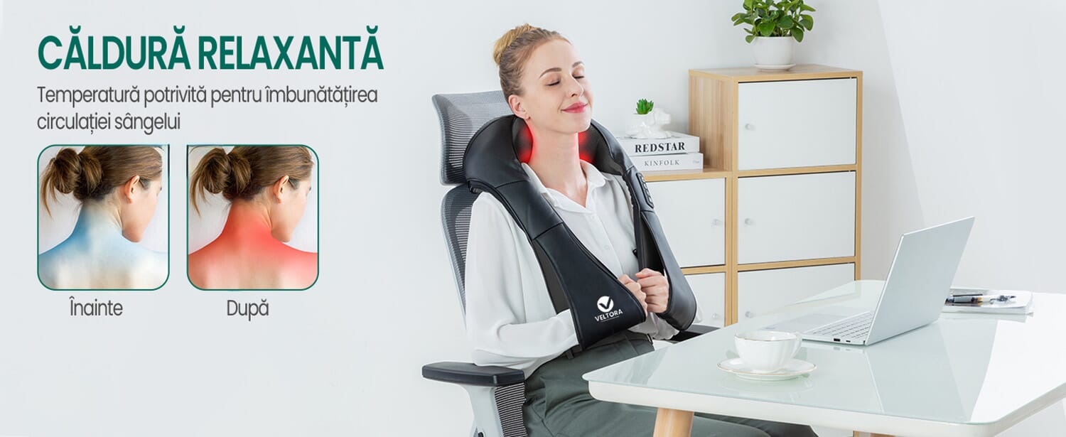 Aparat Profesional Premium Pentru Masaj Umeri 3D Veltora® NeoHeat Relax – creat pentru relaxare profunda si refacerea tensiunii musculare, oferind un masaj de calitate profesionala chiar la tine acasa.