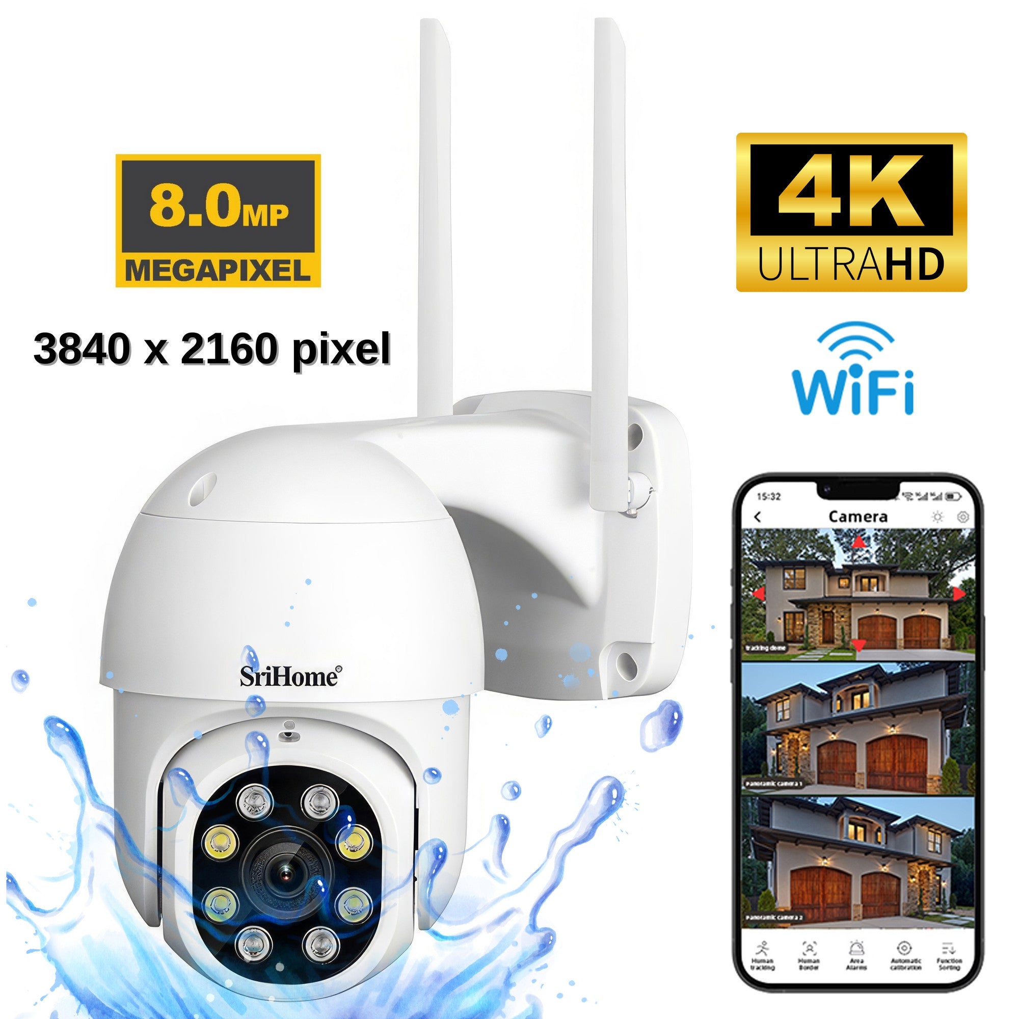 Camera De Supraveghere Video WIFI CCTV SriHome™ SP028 PRO, 8 MP 4K, Interior / Exterior, 4X zoom, Rezistenta La Apa, Comunicare Bidirectionala, Senzor Miscare, Lampi Lumina, Alb