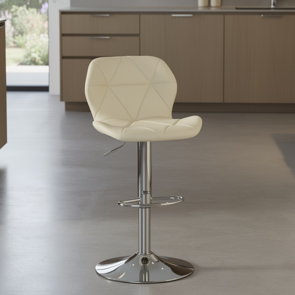 Scaun de Bar Inalt Cu Spatar KD Home® Velvet Rise 360, Rotativ, Picior din Metal, Piele Ecologica, Inaltime Reglabila 60-80 cm, Baza Cromata, Suport Picioare Fix, Pentru Bucatarie sau Living, crem