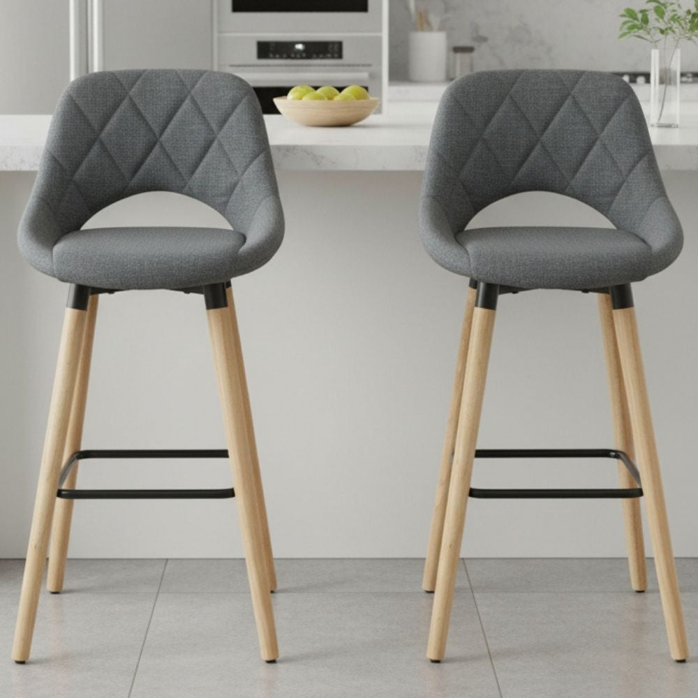 Set 2 x Scaun de Bar Inalt KD Home® BarLuxe Nova, Picioare din Lemn, Rotund, Tapitat, Intaritura Metalica, 47 x 47 x 70 cm, Lemn/Textil, Burete, Gri